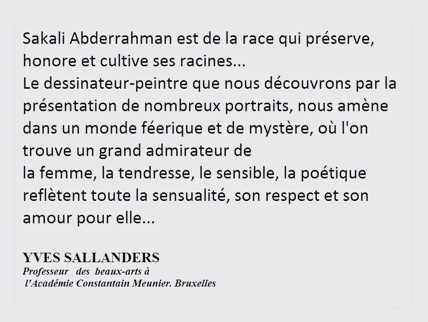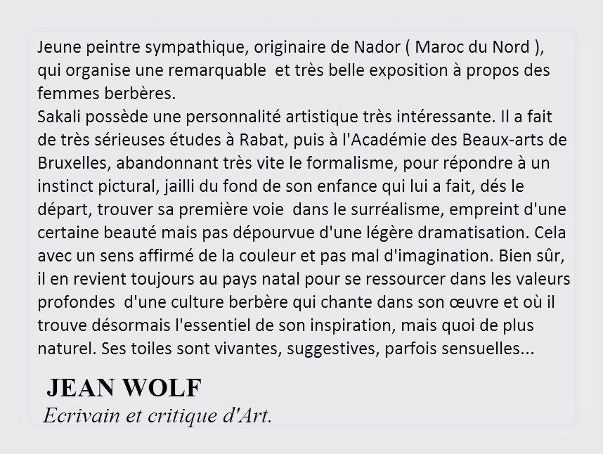 "Les pièces de SAKALI ne sont pas des toiles à découvrir avec béatitude et admiration, elles sont fortes, aggresives et interpellantes. On en sort marqué, le coeur au bord des lèvres..."