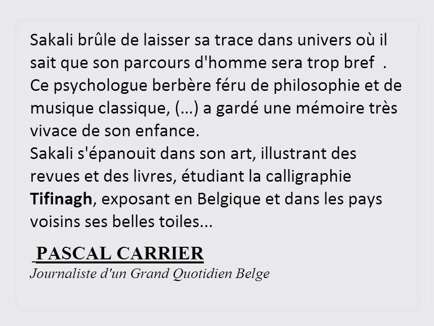 Abderrahman Sakali, un artiste profondément passionné et ancré dans ses racines, a toujours puisé son inspiration dans ses origines. Sa biographie est une mosaïque d'articles, de critiques artistiques et de témoignages qui mettent en lumière son dévouement inébranlable à son art et à son héritage. Chaque œuvre raconte une partie de son histoire, révélant une âme contemplative et avant-gardiste.